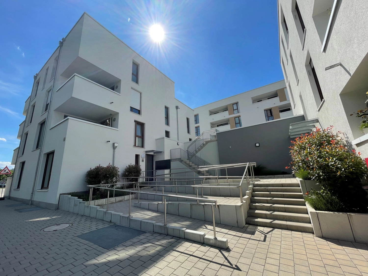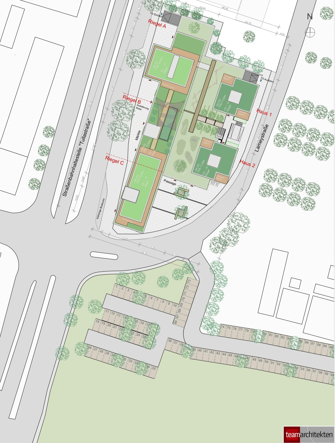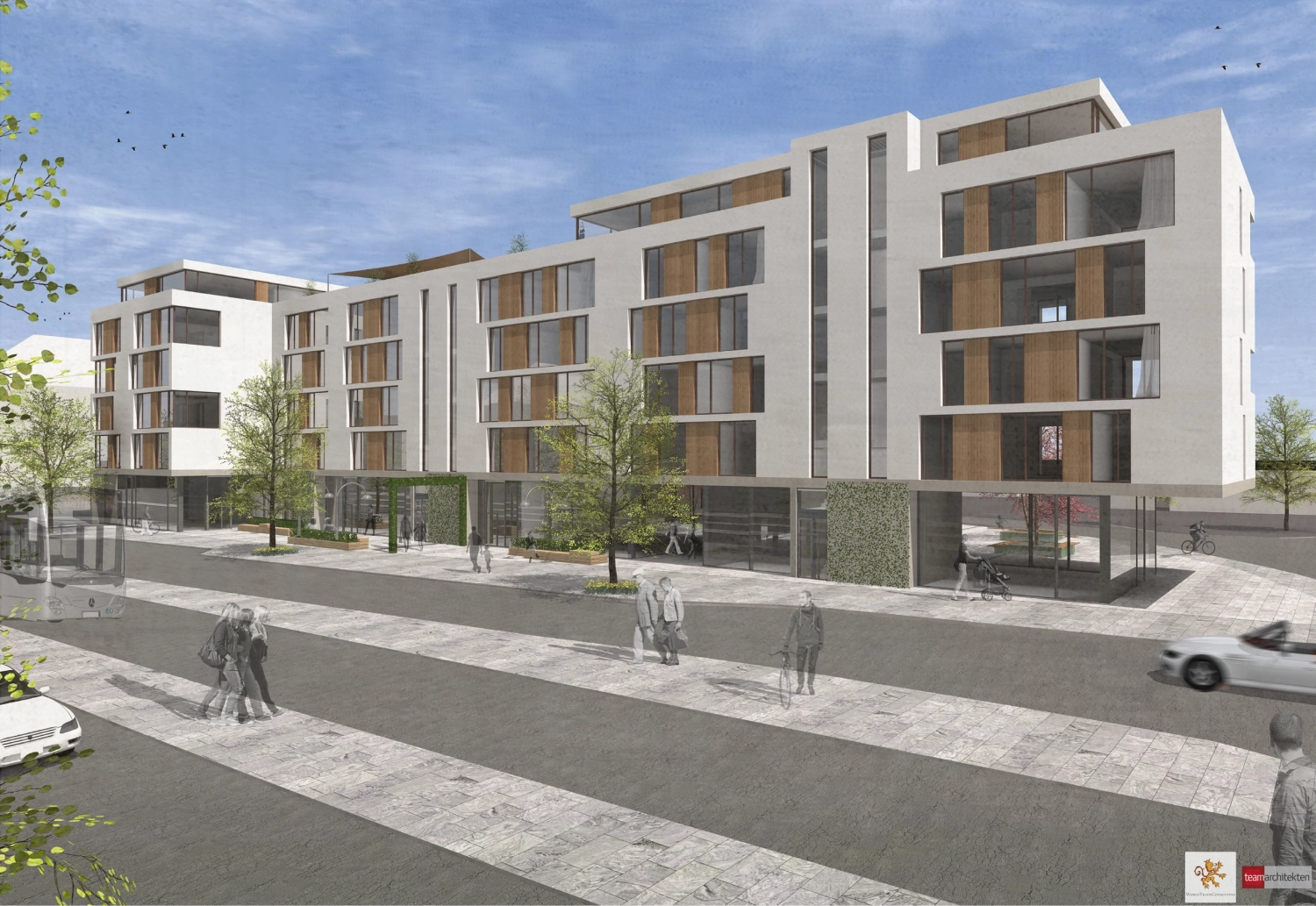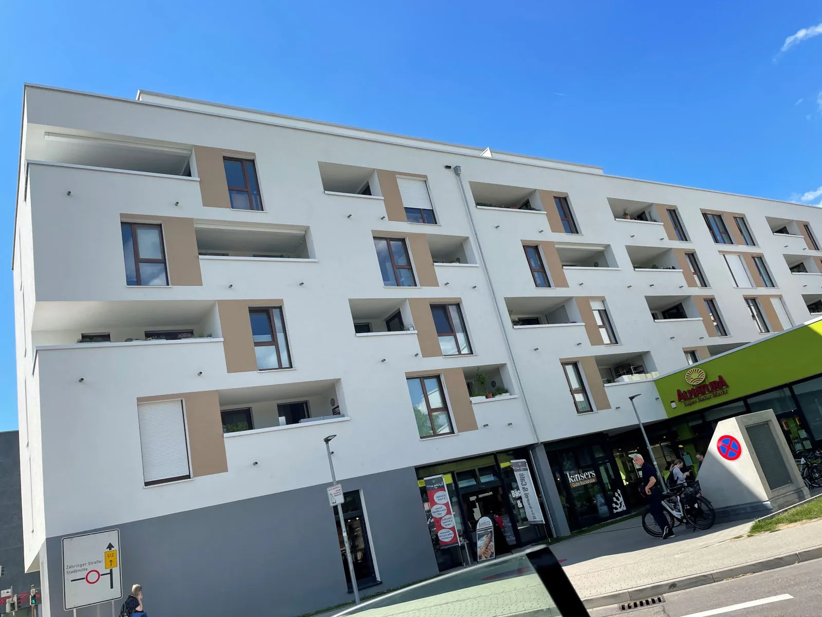 Auf dem Gelände einer ehemaligen Tankstelle erfolgte hier die Planung und Umsetzung eines Wohnquartiers mit 3 Gewerbeeinheiten sowie 84 Eigentums-Wohnungen und einer zweistöckigen Tiefgarage an markanter Stelle in Freiburg. Das Quartier besteht aus einem Riegel entlang der Hauptausfallstraße sowie im rückwärtigen Bereich aus 2 Einzelhäusern, welche durch die Tiefgarage und den geschaffenen Innenraum auf der Decke des Bio Marktes im Erdgeschoss verbunden sind.