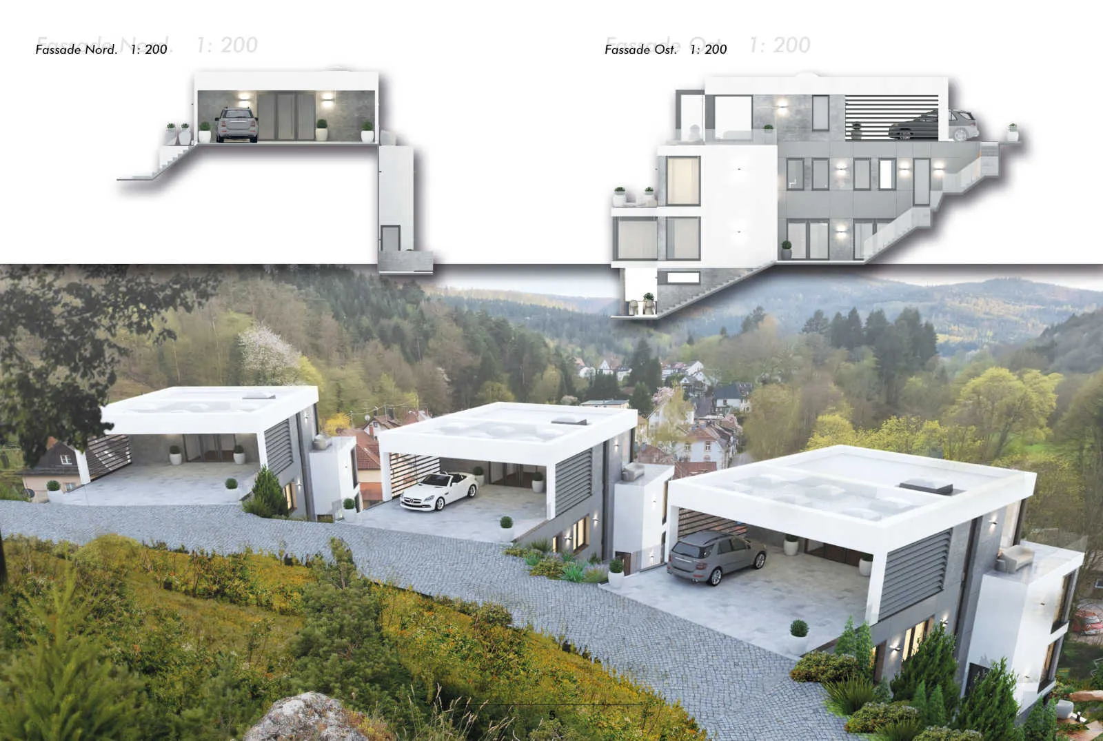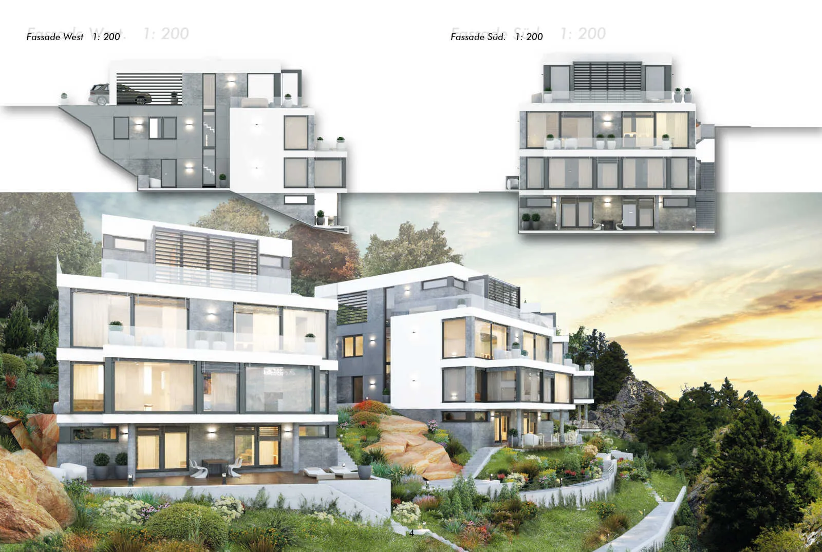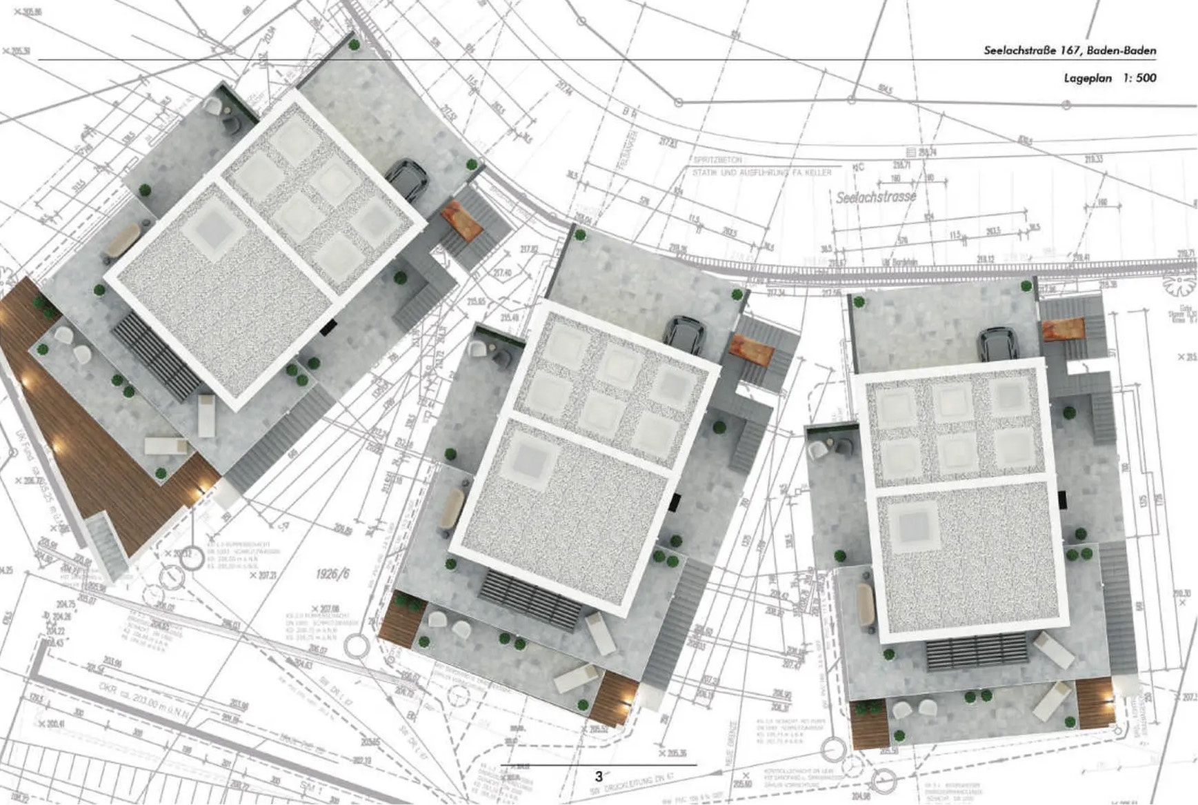 Die ursprüngliche Konzeption der 3 Einzelhäuser wurde verworfen, da die Wohnfläche von über 540m² nicht zu vermarkten war. Der bereits begonnene Rohbau des ersten Gebäudes stand jahrelang leer, bei den beiden anderen Gebäuden erfolgte nur die Gründung. Hier erfolgte dann durch unser Büro die Umplanung in drei Mehrfamilienhäuser mit jeweils 3 Wohnungen pro Einheit in herrlicher Aussichtslage von Baden-Baden.