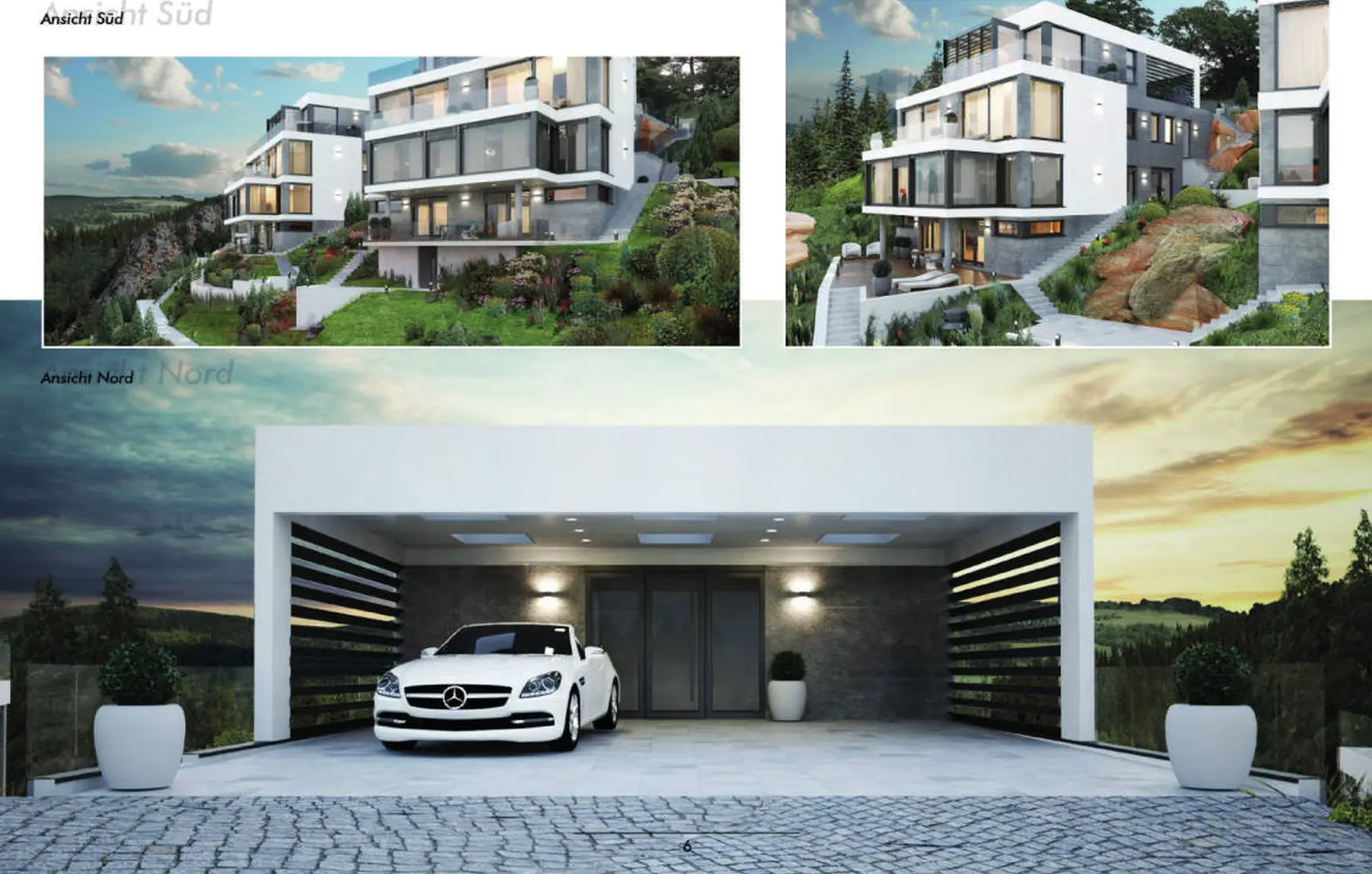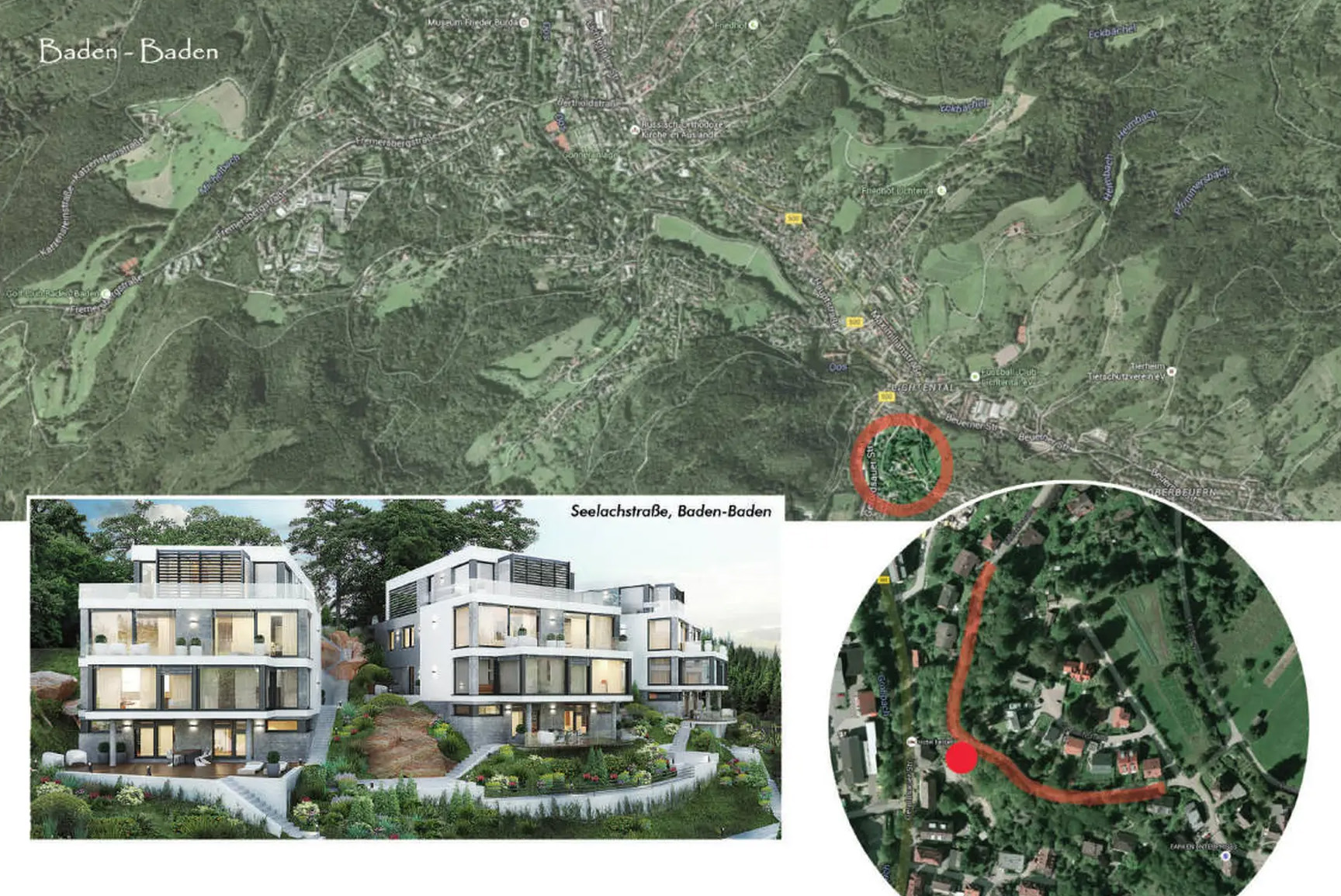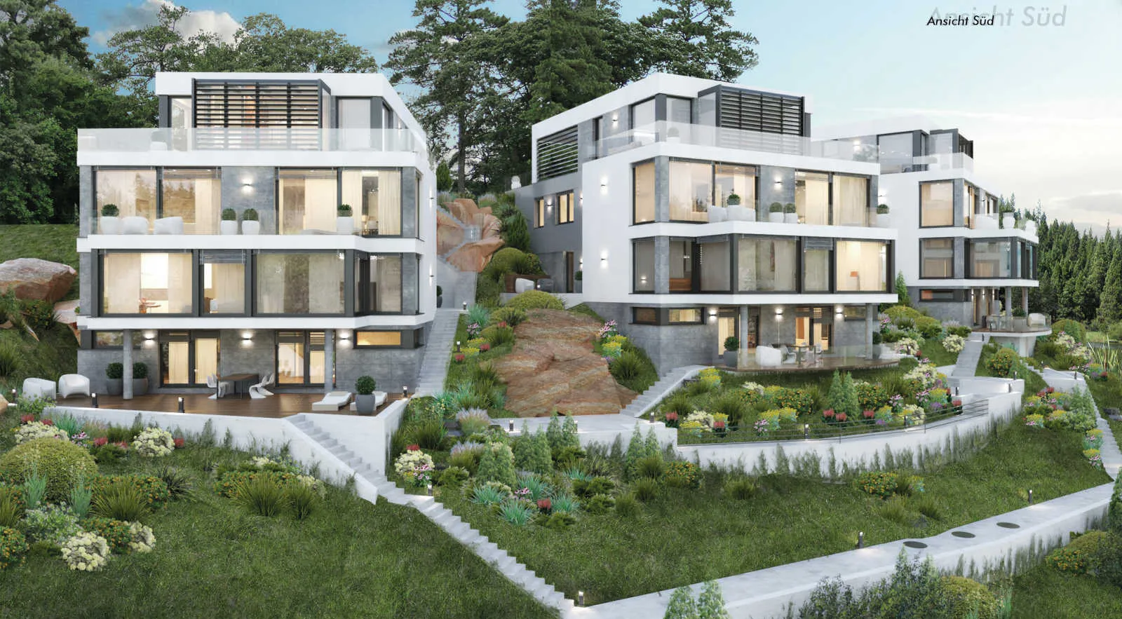 Die ursprüngliche Konzeption der 3 Einzelhäuser wurde verworfen, da die Wohnfläche von über 540m² nicht zu vermarkten war. Der bereits begonnene Rohbau des ersten Gebäudes stand jahrelang leer, bei den beiden anderen Gebäuden erfolgte nur die Gründung. Hier erfolgte dann durch unser Büro die Umplanung in drei Mehrfamilienhäuser mit jeweils 3 Wohnungen pro Einheit in herrlicher Aussichtslage von Baden-Baden.